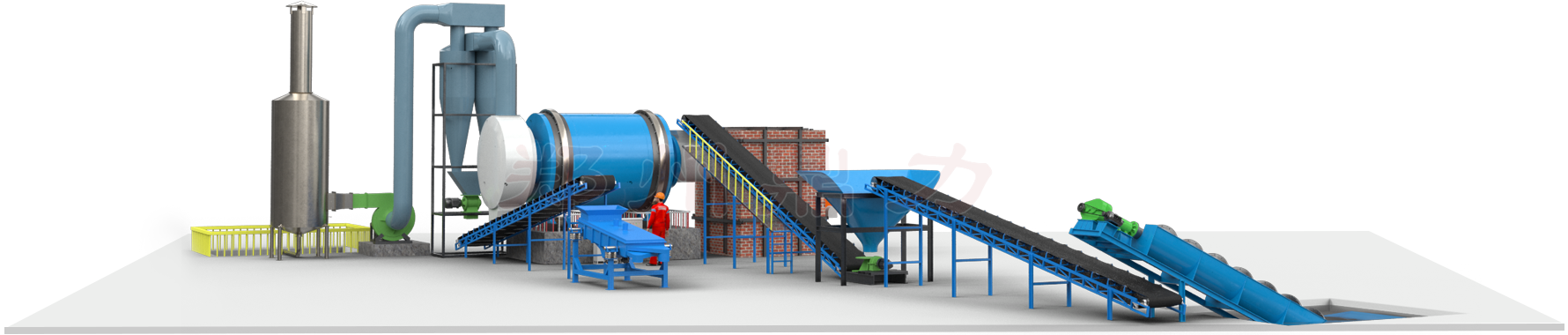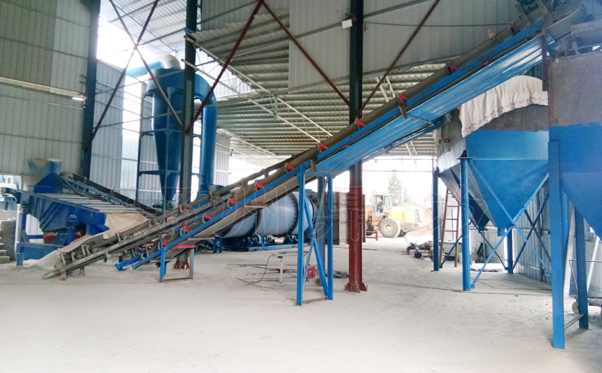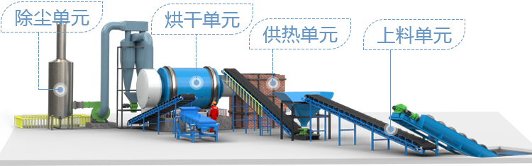 河砂烘干機生產線組成:熱源系統、給料系統、輸送皮帶、進料溜槽、烘干設備、出料皮帶、振動分級篩,除塵系統、引風機、電控系統等設備。